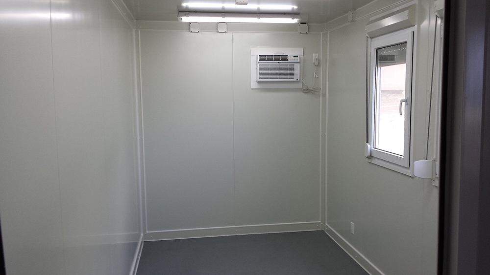 Interior photo shows the steel walls, not drywall. Very cool indeed! Heavy duty vinyl floor.