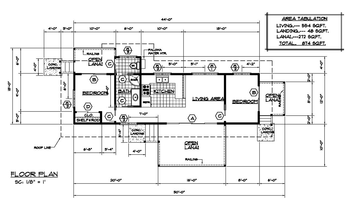 One of our Lava Runner designs was featured in a research paper done by the National Assoc. of Realtors! Take a look at this floorplan and tell us if you don't think this is a fabulous and functional design that could comfortably accommodate two adults and two children. All the lanais and landings are designed to be quickly detached from the main house, and within four hrs. max time the center post and piers can be removed, plumbing and electricity disconnected, and a low-boy trailer can back right underneath the house and move it. Our Lava Runner series of homes can be made any size but no wider than 14 ft. on any one module if you desire portability, and are perfect for areas like Lower Puna. You could very easily save your home if lava threatened it. Of course, every home that we design can be built as a permanent home, on post and pier, on a slab, or whatever you need, and permanent homes can be built at any width so long as you do not plan on moving it.