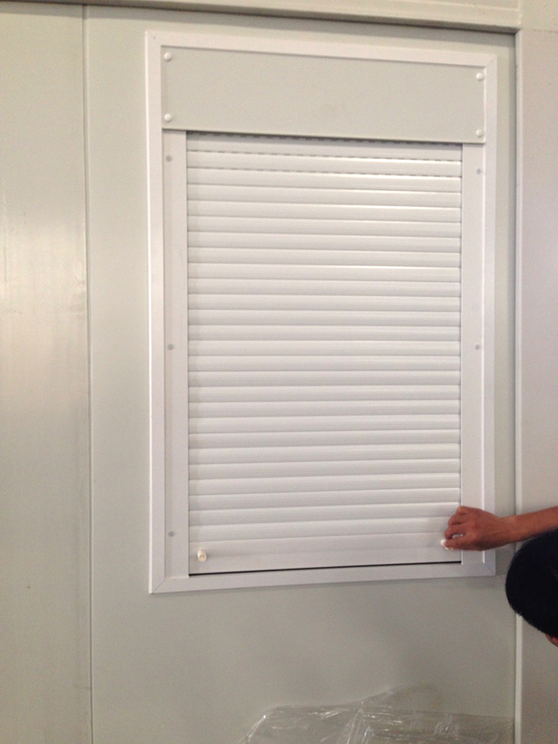 Closer look at the rolling steel shutters on factory window exterior. A little added security and a nice touch!